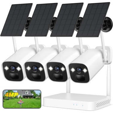 【【400万画素】電池式 太陽光給電 防犯灯発光 AI人物検知 10台増設 監視カメラ 屋外 ソーラー 大容量バッテリー Type-c端子充電 完全無線 工事不要 IP66防水防塵 130°広角 双方向通話 ワイヤレス防犯カメラ4台セット H.265+動画圧縮 MicroSDカード(別売) 2.5インチ内蔵式HDD(別売)対応 遠隔設定 (電池式防犯カメラ4台+ソーラーパネル4台+ミニ録画機)【