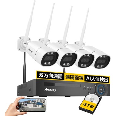 【2880P/500万画素 ・フルカラー録画・3TB HDD内蔵 】ワイヤレス 防犯カメラ AEAZZY 4台セット 無線 監視カメラ 屋外 2560P 500万画素 双方向通話 AI人体検知 IP67防水 WDR技術 遠隔監視 カラー暗視 8ch H.265映像圧縮 レコーダー 8チャンネルまで増設可 常時録画 声光威嚇 盗難防止 日本語サポート 屋内/屋外 セキュリティ 防犯カメラ